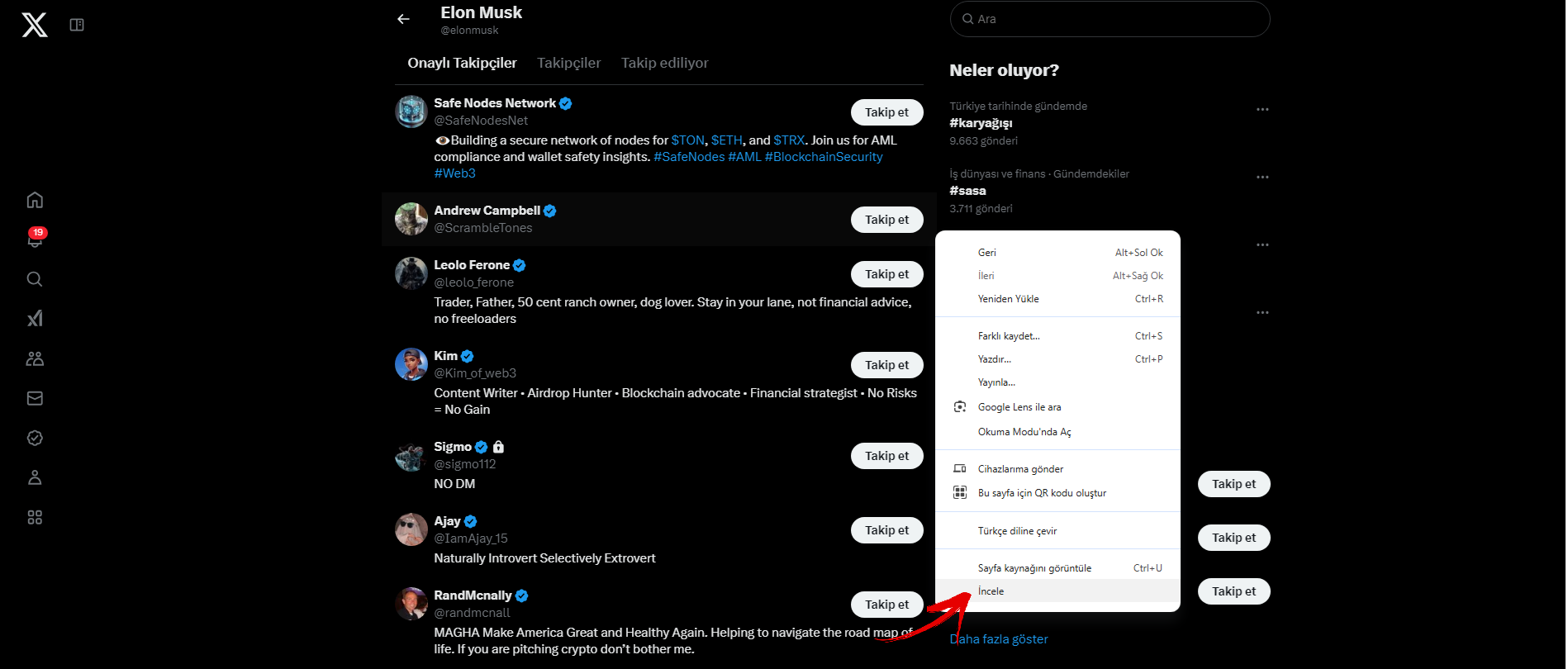 elonmusk tıkladık, sayfada boş bir alan sağ tıklıyoruz ve incele diyoruz.